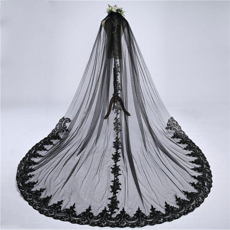 Black Wedding Veil Cathedral Length Applique Lace Edge 1 Layer With