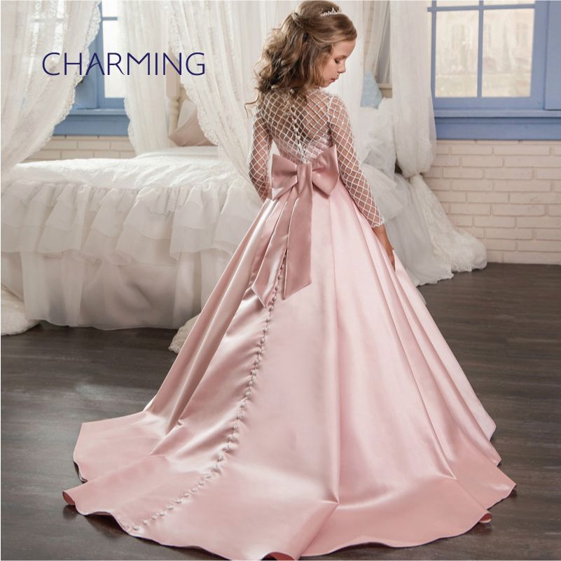 Girls Dress For Exquisite Communion Pink Long Lace Tulle Wedding