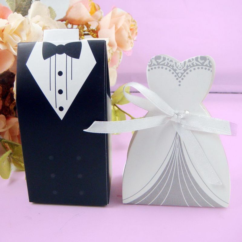 Us 15 99 30 Off 100pcs Bridal Couple White Wedding Dress Candy Box Irregular Tuxedo Black Suits Tiny For Guest Bride Groom Wedding Dress Boite In