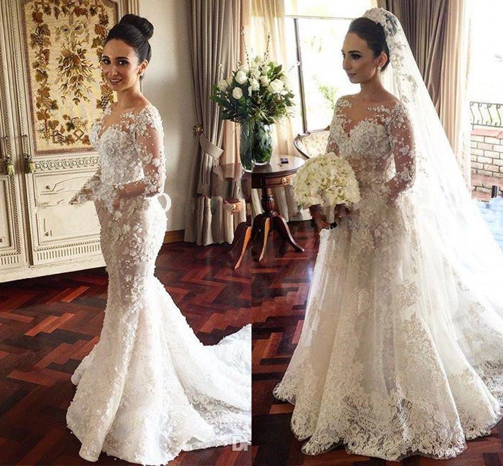 Long Sleeves Lace Mermaid Wedding Dresses Detachable Skirt Sexy Lace